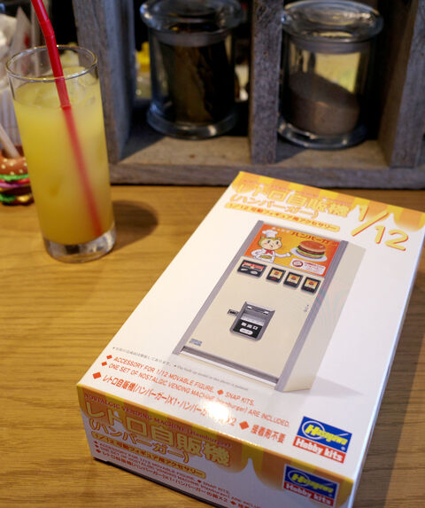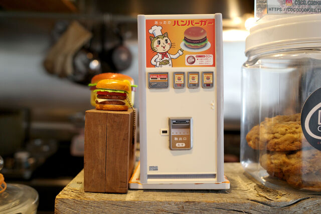 自分の座ったカウンター席の目の前に場末のドライブインにありそうなハンバーガーの自販機のミニチュアが・・・。