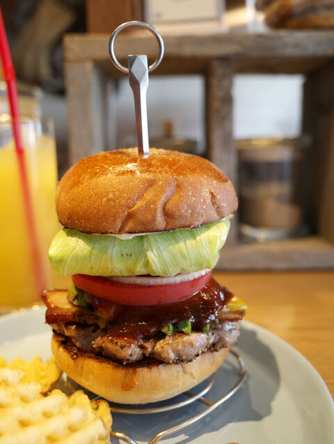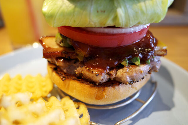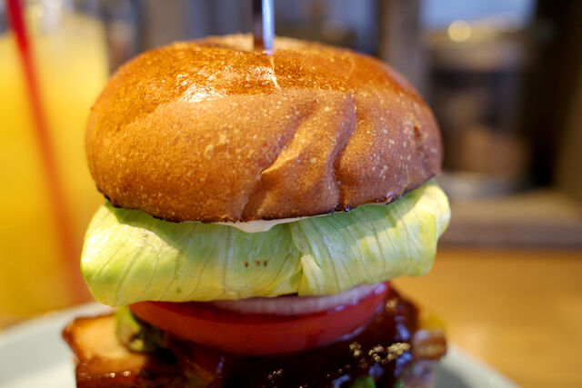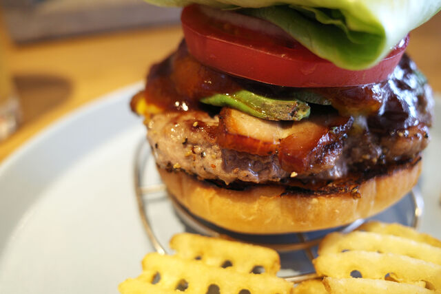 上パティ、自家製ベーコン、チェダーチーズ、アボカド、BBQソース、トマト、オニオン、レタス・・・
