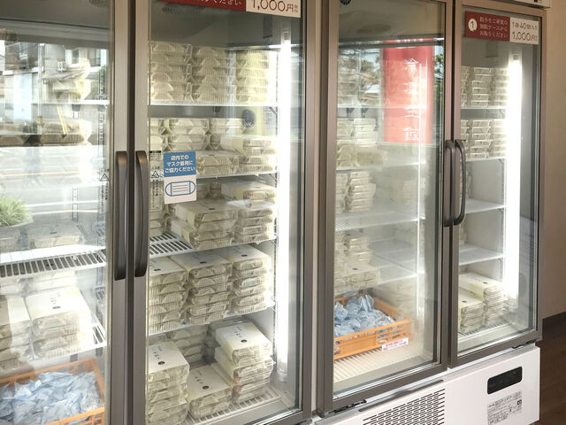 扉付きの大きな冷凍庫があるだけのがらんとした店内。無人販売所なので自分で扉をあけ必要な量の餃子を取り出す。