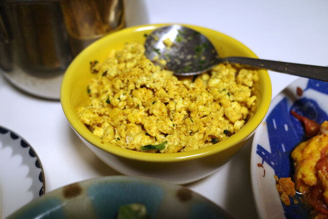 ヨメさんが作ってくれたスパイス炒り豆腐。これカレーそぼろみたいで美味しいんだ。