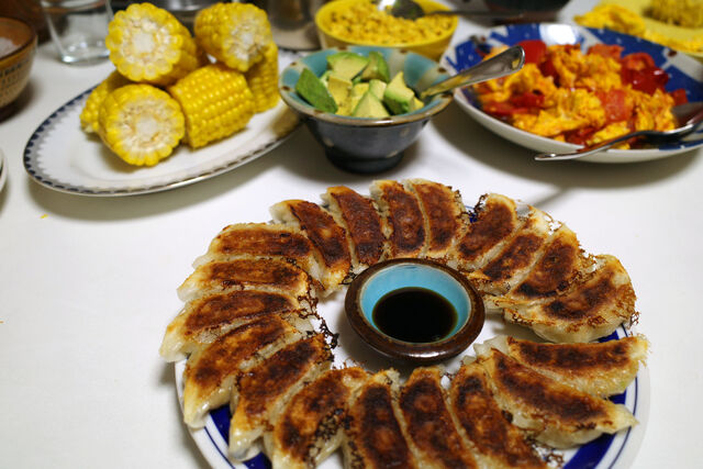 夜来香の焼き餃子の他にこの日食卓に並んだのは頂き物も甘いとうもろこし、カットアボカド・・・