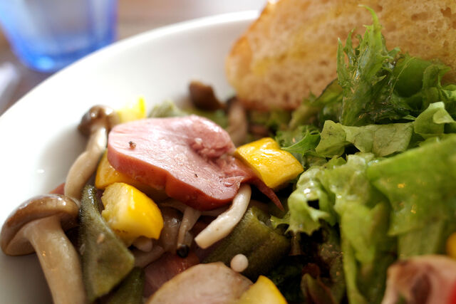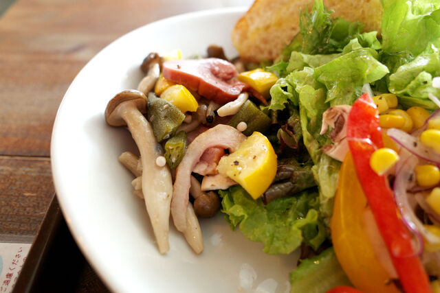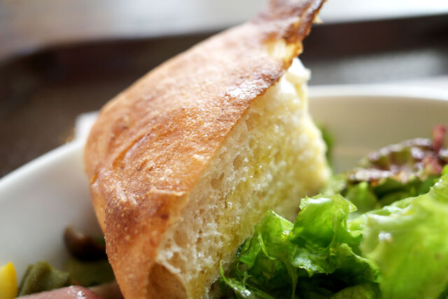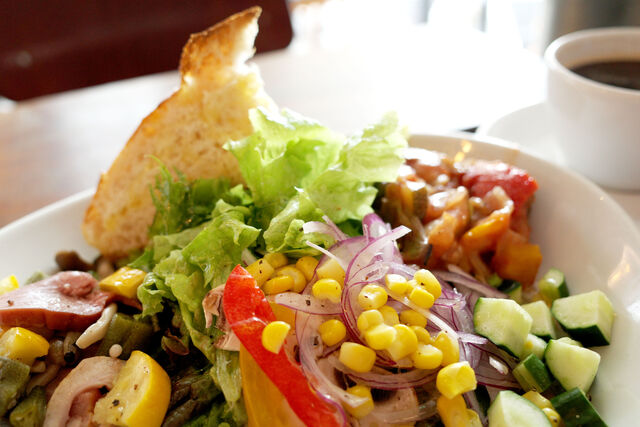 盛り盛りサラダに2種のデリ、パンのセットが基本となっており、そこに更に料金を追加することでキッシュやスープをつけることもできる。