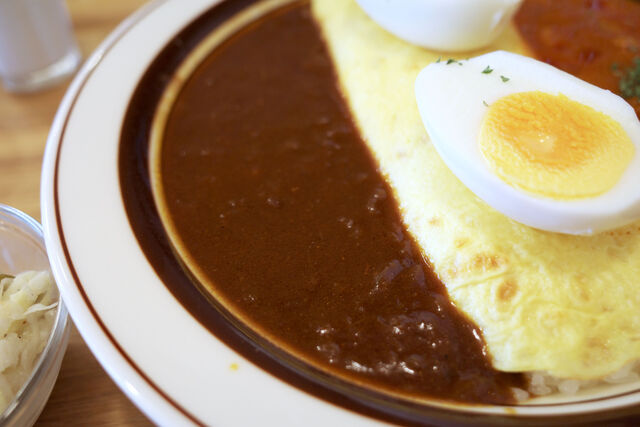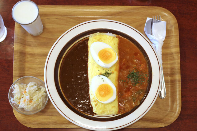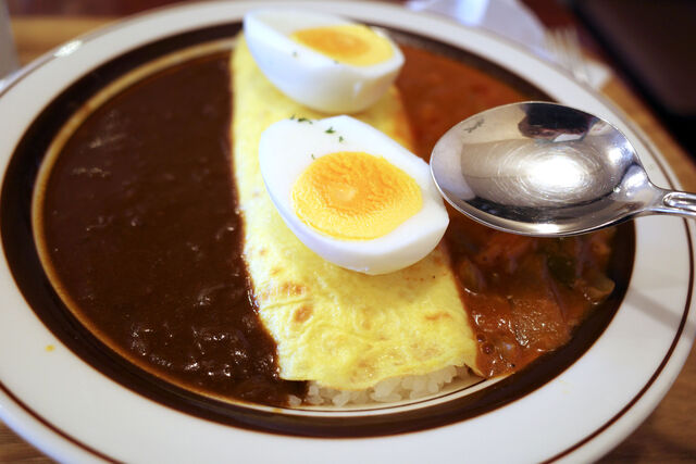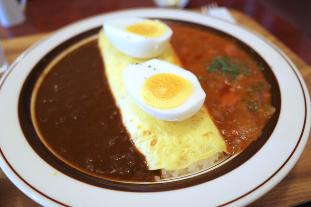 門特製カレーライスと期間限定のナポリタン風カレーのあいがけ(ゆで玉子トッピング)をオーダー。