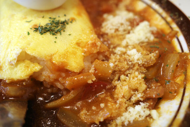 カレーでありながらナポリタンスパにタバスコかけてちょっとピリリとさせた昔ながらの喫茶店のナポリタンの味をいい感じに再現。そして途中から粉チーズをかけると更にナポリタン感倍増!