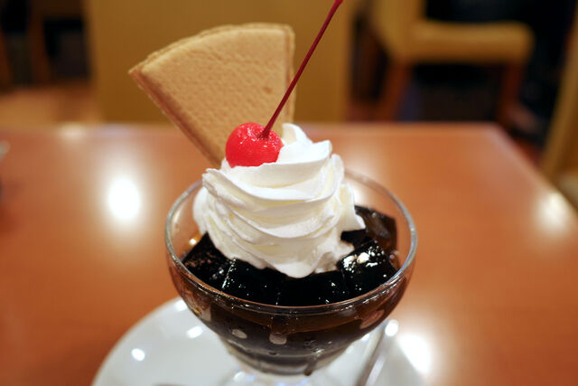 コーヒーゼリーの上にはホイップ、チェリー、そしてウエハース。