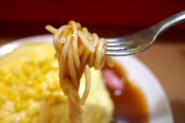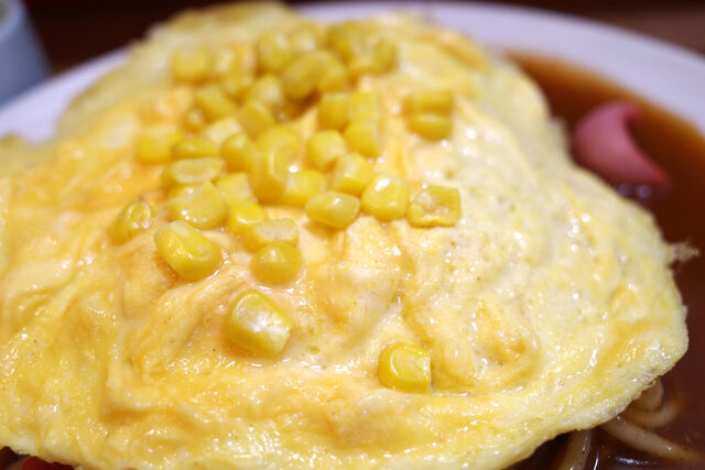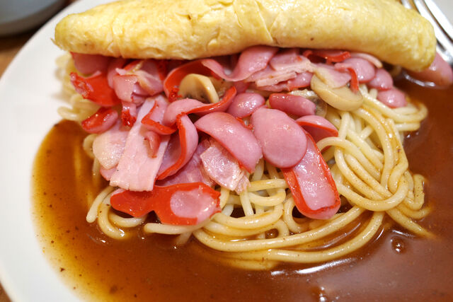 コーンたっぷりのオムレツをぺろんとめくると下には赤ウインナーとベーコンがたっぷり。