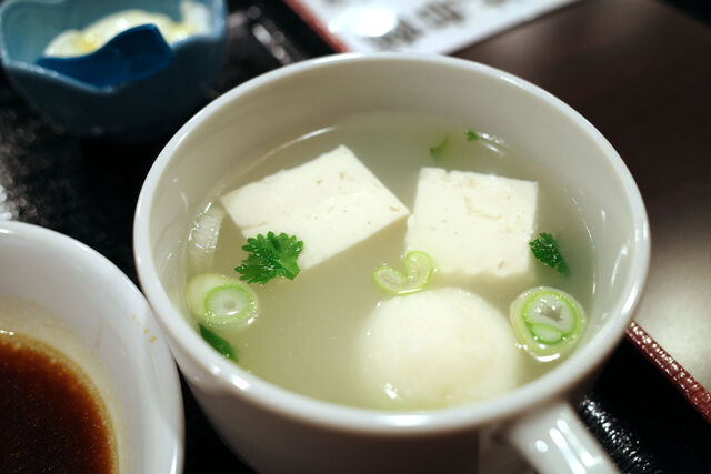 スープも美味しい。丸いのはエビのすり身かな。