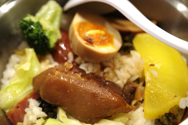 このお弁当箱、2重構造になってました。爌肉の入ったプレートを外すと下からご飯と香腸、高菜などが出てきました。
