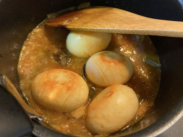 テンパリングした後、荒く切った玉ねぎを炒めたらパウダースパイス、水、ターメリックと一緒に軽く炒めた茹で卵を加えグツグツ。
