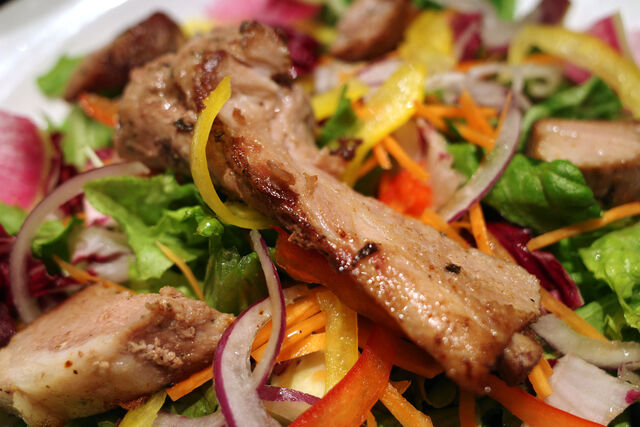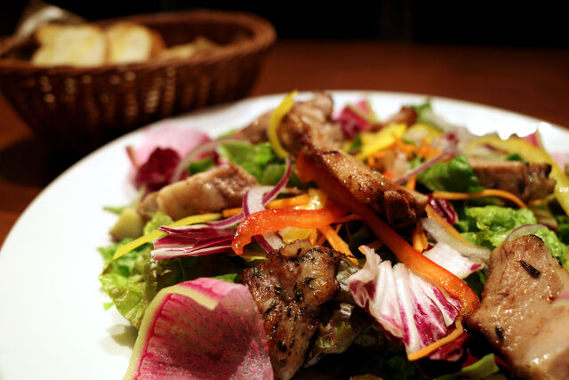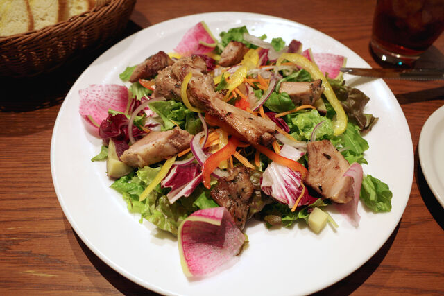 前回は「今週のサラダ(鶏のコンフュ)」を選択したので今回は生ハムサラダをオーダーするつもりだったんだけど念の為に週替わりサラダが何なのか質問してみると「スペアリブです」とのこと。