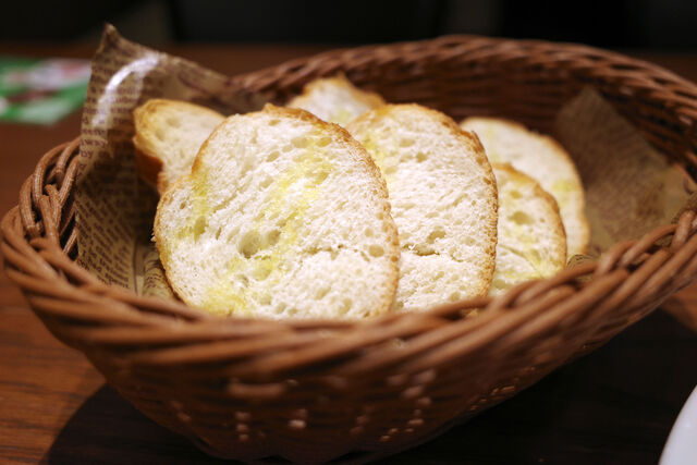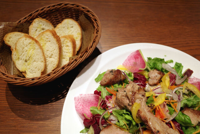 通常、サラダにゼッポリーネとドリンクが付いてくるんだけどこの日はゼッポリーネが売り切れちゃったとのことでかわりにバゲットを用意してくれた。