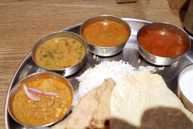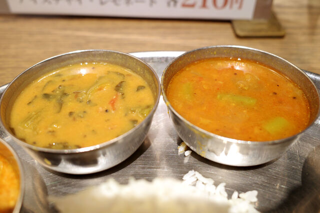 左から選べるカレー、本日の菜食小皿、サンバル、ラッサム