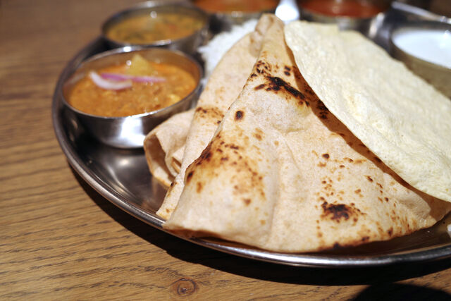 ロティは全粒粉を使った無発酵の素朴なパン。日本でインド料理というとナンのイメージが強いけど実際にインドの家庭で食べられているのはこのロティ(←地域によってはチャパティと呼ぶ)の方が一般的なんだとか。