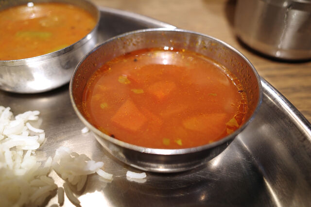 ラッサムは酸っぱ辛いスープ。ライスにラッサムをお茶漬け的にかけてサラサラ掻きこむのもウマいんだよな。