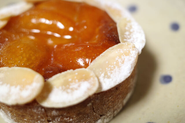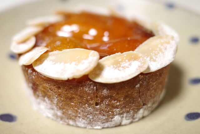 スライスアーモンドで飾られた小さなタルト台に甘酸っぱい金柑のコンポートがたっぷり。