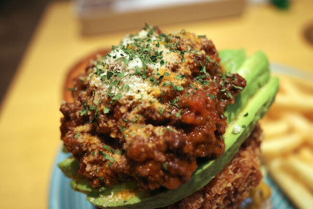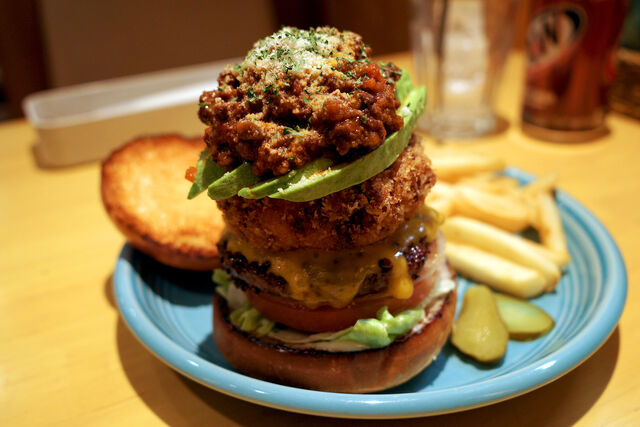 チェダーチーズのかかったビーフパティの上に分厚いマカロニチーズフライ、アボカド・・・