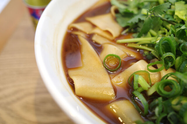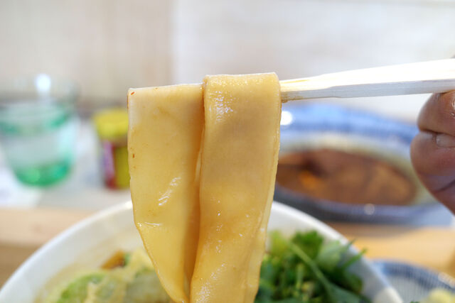 幅広の麺は特に白いシャツを着てるときは啜るのに細心の注意が必要だけど食感が良くて美味しいんだ。
