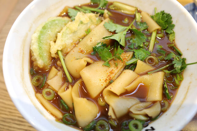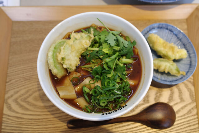 オーダーはきしめん並を味噌つゆで。そこにパクチーとアボカド天をトッピング。