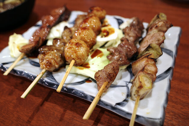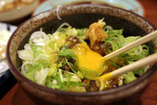 そしてきも善といえば忘れちゃならないのが肝、モツ、ハツ、砂肝を焼いて生ネギとニンニクパウダー、生卵をトッピングしたスタミナメニュー「遮断機」これ最高なんだ。