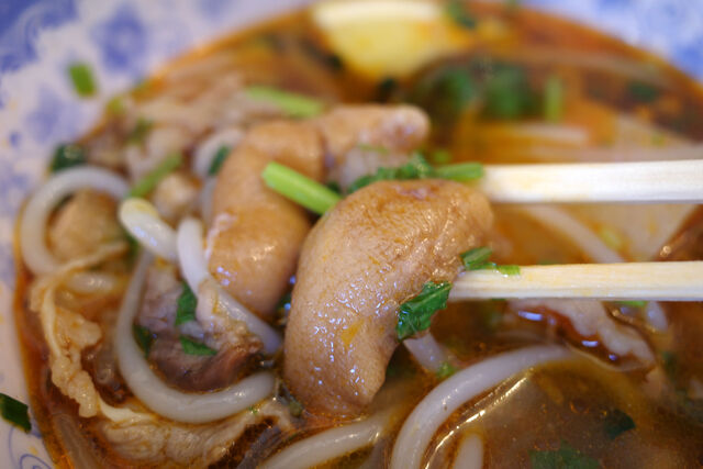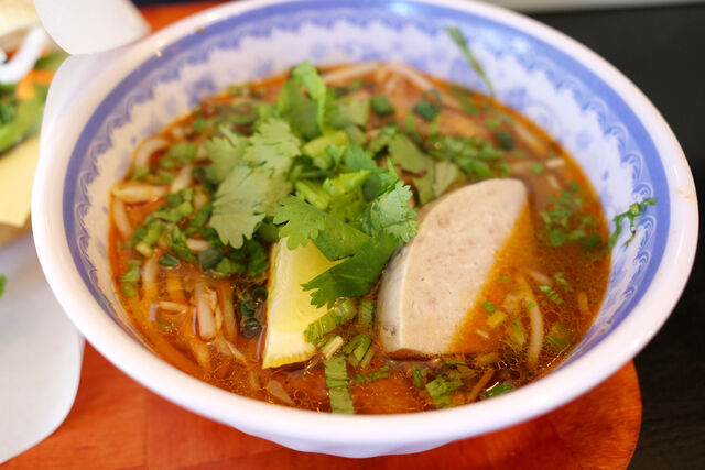 ブンボーフエは牛骨や豚足から出汁をとったピリ辛麺。ベトナムハムや豚足が入っていて食べ応え抜群です。