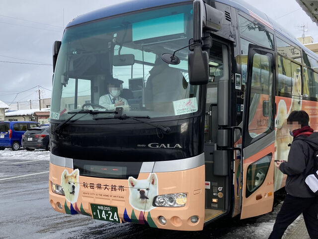 雪のないシーズンはレンタカーを利用して移動しているけど冬場は公共交通機関移動。秋田犬ラッピングの高速バスでまずは盛岡駅へ。