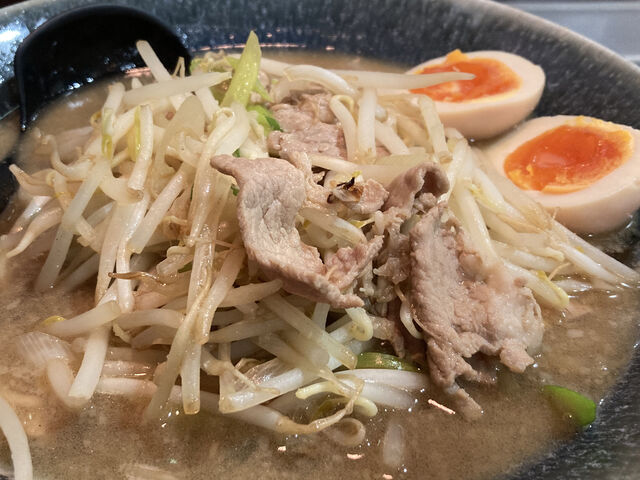 背脂のたっぷり浮いた醤油ベースのスープに中太麺。上には豚肉ともやし、ネギを炒めたものがどっさりと。