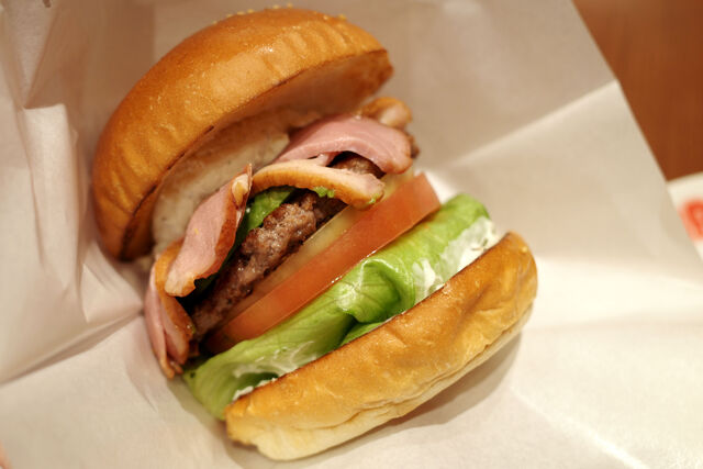 下からレタス、トマト、スライスオニオン、パティ、アボカド、スモークドダック、サワークリームオニオンという構成。