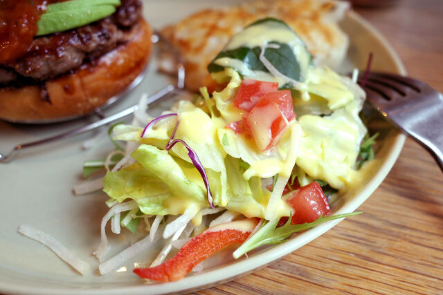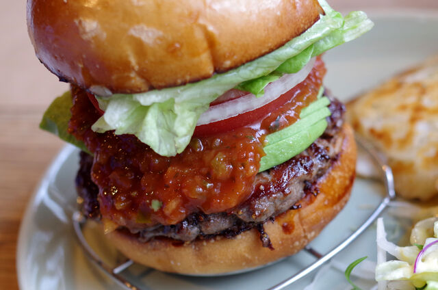 通常の牛100%パティに上ロース肉を加えた上パティにアボカド、自家製サルサソース、トマト、オニオン、レタス。