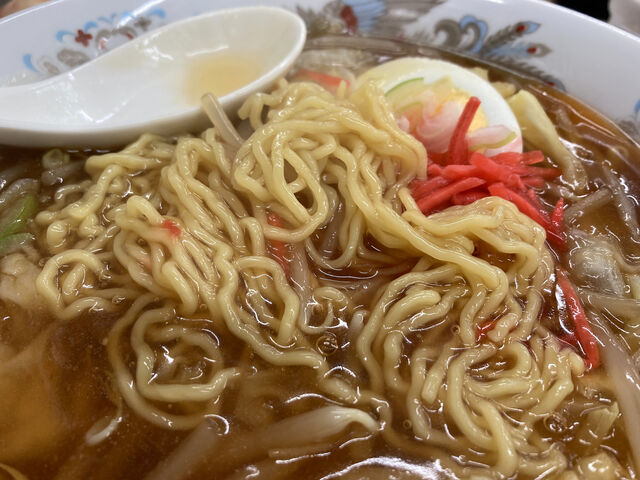もやしとキャベツがたっぷり入ったとろみのあるスープにちぢれ麺、ゆで卵、紅生姜。