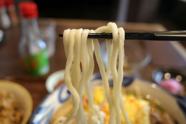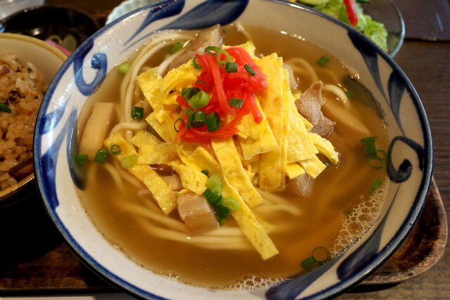 沖縄そばは薄焼き卵と刻んだ三枚肉のそば。