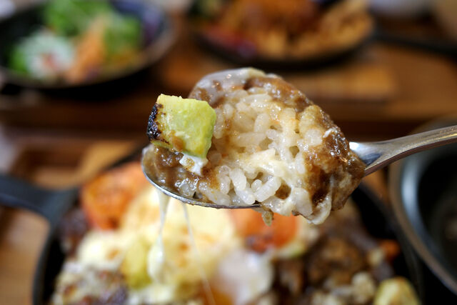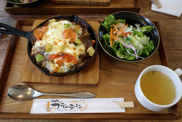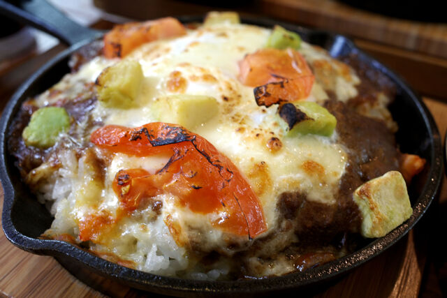 自分がオーダーしたアボカドとトマトの焼きチーズカレーはこんな感じ。焼きチーズカレーの他にサラダとスープがついてきました。