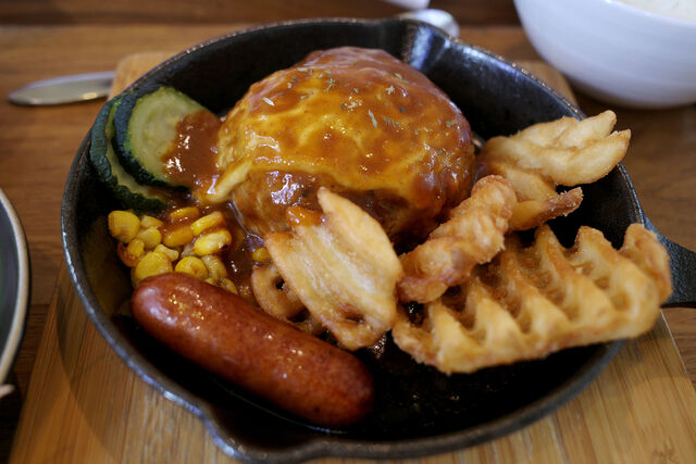 ハンバーグはスキレットで提供。苦手なズッキーニはおとーちゃんのお腹の中へ。笑