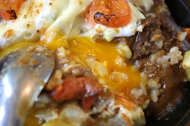 チーズの下に隠れた卵黄を潰して混ぜ混ぜしながらいただきます。