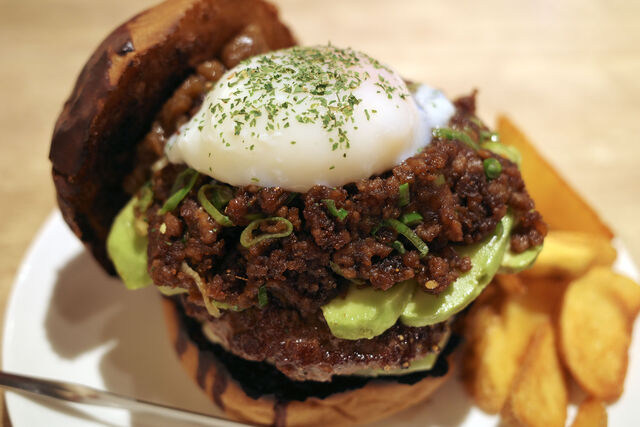 下からレタス、ビーフパティ、アボカド。そしてその上に赤味噌で仕立てたたっぷりの肉みそと温泉玉子。