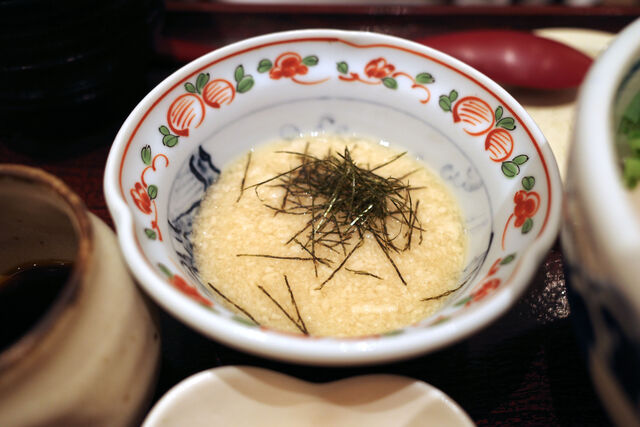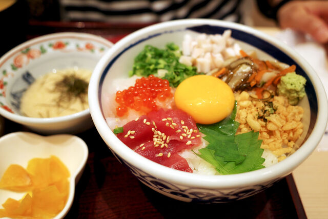 このカラフルな丼にとろろとだし醤油をかけ玉子をくずしてお召し上がり下さいとのこと。