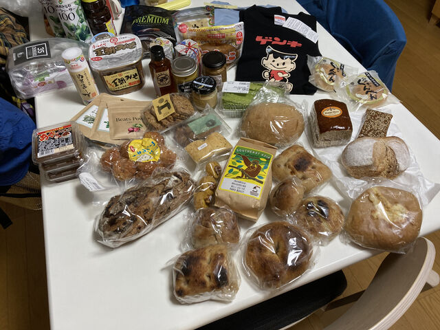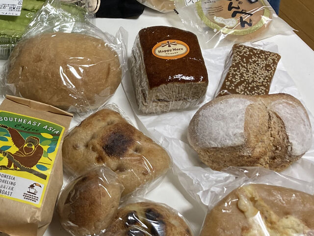 下段左から浦添市のコーヒーロースター”沖縄セラードコーヒー”のコーヒー豆(マンデリン)、宜野湾市、宗像堂のアーサーフォカッチャ、黒糖まるパン、読谷チーズブレッド、右下のは”パン屋 水円”の黒糖チーズパン。