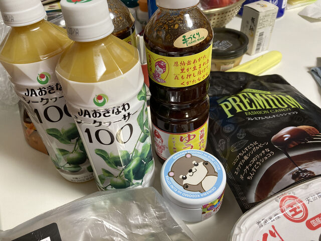 最近ヘビーリピートしているJAおきなわのシークヮーサー100%果汁に、森三中がYouTubeで激推ししてたということでヨメさんが熱望した恩納村農山漁村生活研究会の”万能たれ ゆうな”、ファッションキャンディの”プレミアムちんすこうショコラ” あとカワウソのイラストのはなんだったけな?たぶん息子の欲した何か。