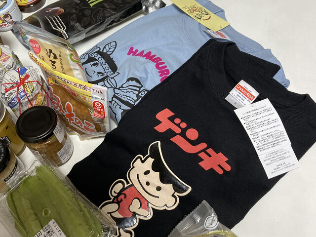 オキナワソバEIBUNの近くの服屋さんでゲットしたTシャツ2点(左:今はなき沖縄ローカルのハンバーガーチェーン"ビクモン”のキャラクターTシャツ。 右:石垣島のローカル乳業”八重山ゲンキ乳業”のキャラクター”ゲンキ君”Tシャツ。)