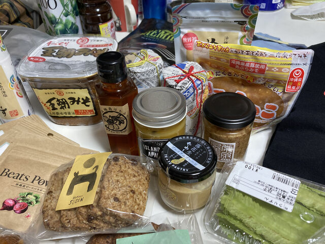 左上から時計まわりに、ヨメさんお気に入りの玉那覇味噌醤油の”王朝みそ”、おきなわBee Happyの”屋我地島はちみつ”、我が家の定番調味料 SUNNY&MEの”サマーデイ麻油”と”イエスタディ辣油”、誠平コーディアルの”リリコイバター”、ぬちまーす、みそのこ食品のあぶらみそ”みそのこ”、北中城のパン屋さん”ときはや”のピーナッツバター、ネクストステージ沖縄のピーナッツペースト”落花生ぐゎー”、うりずん豆(四角豆)、パン屋水円のクッキーなどなど。