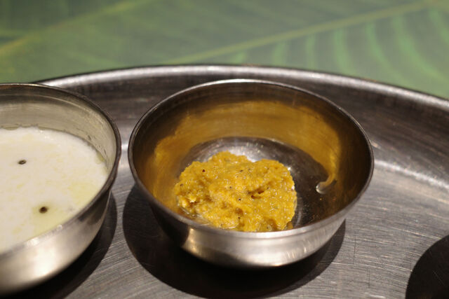 ポテトマサラの入ったドーサを手でちぎりサンバルやココナッツチャトニ、マサラエッグなどにディップしながらいただく。