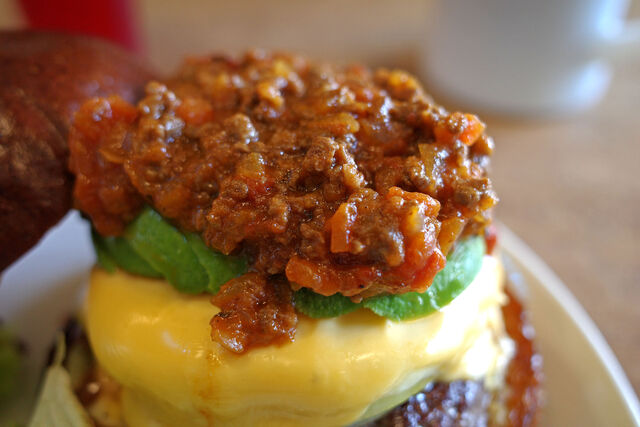 ”ノンフレッシュベジ”バーガーと言うことで通常マストなフレッシュトマトとレタス抜きのこのバーガー。下からハンドチョップのビーフパティ、グリルドオニオン、マッシュポテト、チーズ、ミートソースという構成。トッピングのアボカドはチーズとミートソースの間に。