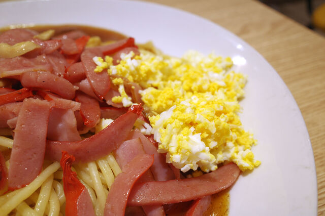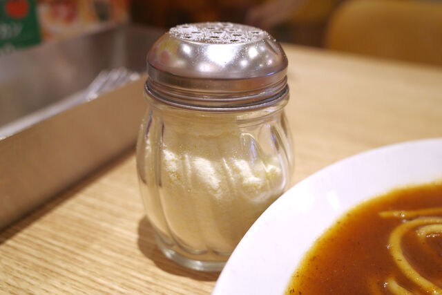 ”ミラネーズ”はウインナーやベーコンの乗ったあんかけスパ。卓上のチーズをかけていただきます。