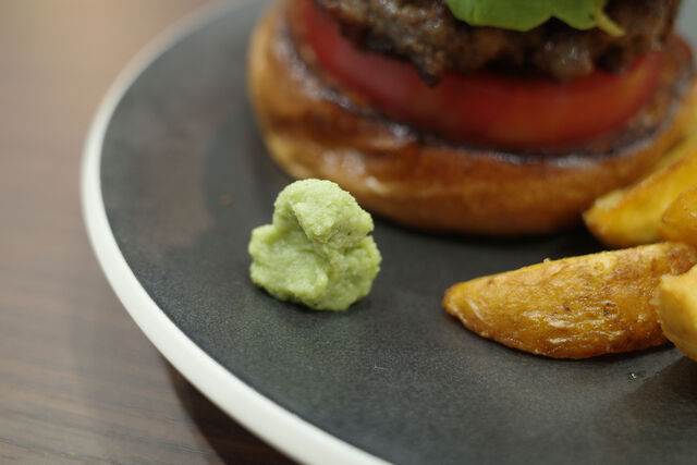 バーガーの傍らに添えられたワサビ。トッピングのアボカドについてきたアイテムだと思うんだけどこれを付けてたべると味がキマって最高!