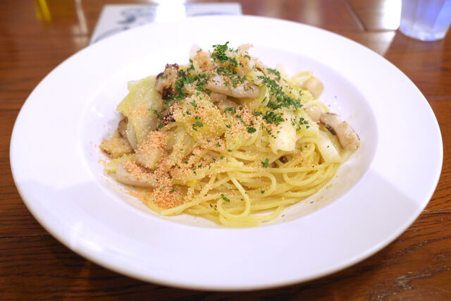春キャベツの甘みに炙った蛸の食感、ほぐしタラコの風味。最後まで食べ飽きないパスタ。