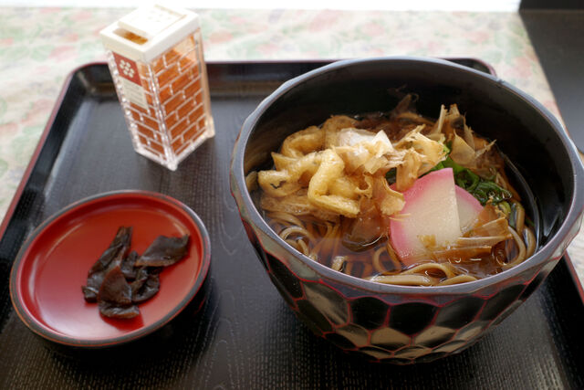 直売所のおばさんが作ってくれる素朴な田舎そば。具はネギ、お揚げ、花鰹、蒲鉾。