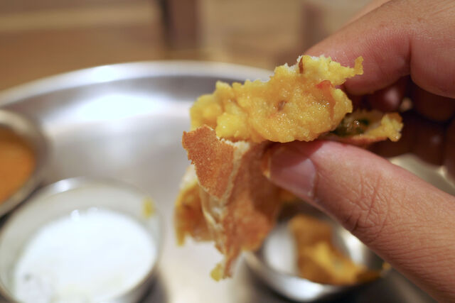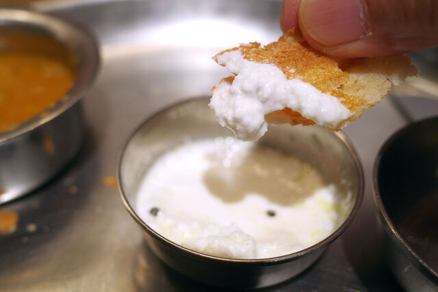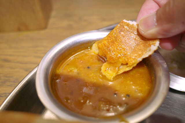 まずは外側のパリパリ部分をサンバルやココナッツチャトニにダイブさせながら愉しみポテトマサラのあるポイントを目指す。