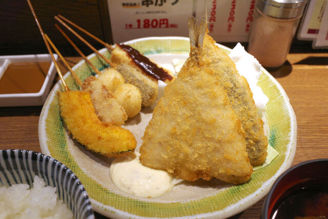 アジフライ2枚と5種類の串揚げ。