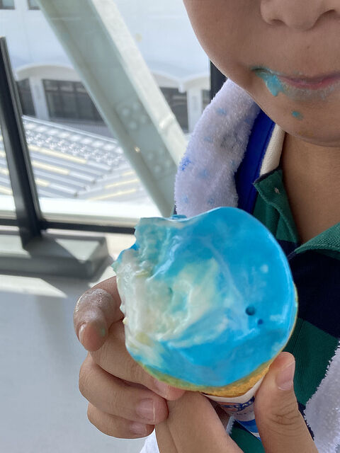 お次は息子が食べたもの。これは2日目の午後だったかな。ブルーシールアイスが食べたいと言うので立ち寄った”道の駅かでな”で息子の一択メニュー、ブルーウェーブのシングルをコーンで。