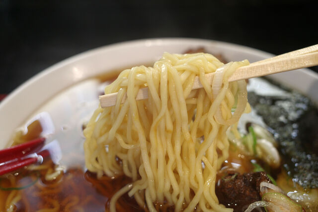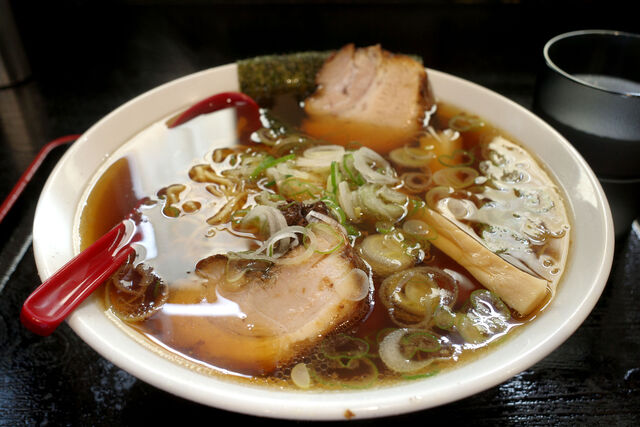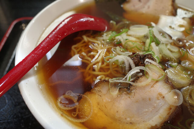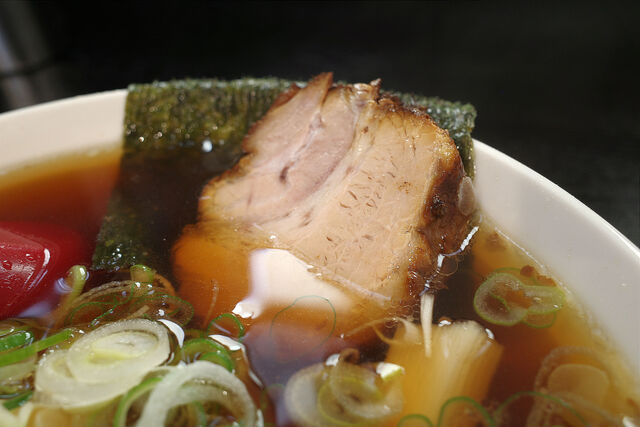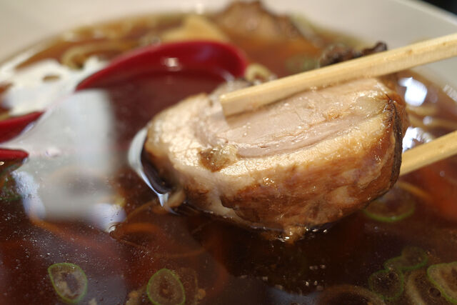 しょうゆ味のすっきりしたスープに極厚チャーシューが2枚。このチャーシューがウマいんだ。