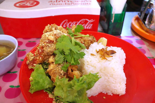 星型に盛り付けられたジャスミンライスのまわりに揚げたてのポンガイトードがどっさり。